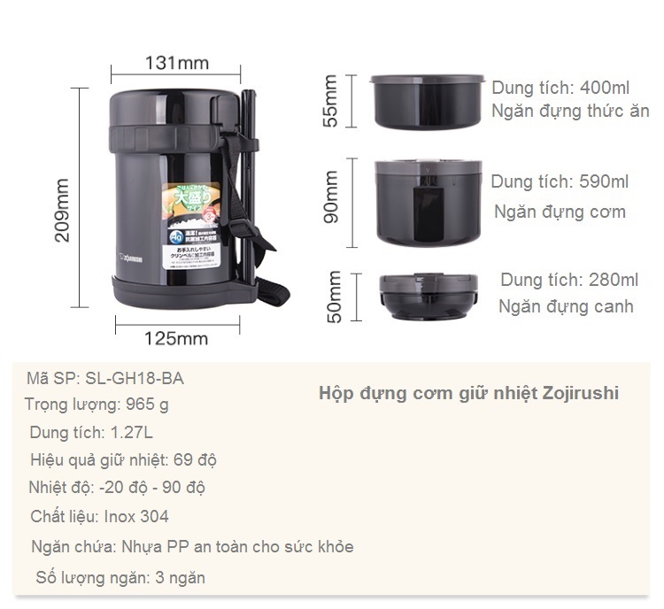 Hộp cơm giữ nhiệt 3 ngăn Zojirushi SL-GH18-BA dung tích 1,27L được sản xuất theo tiêu chuẩn khắt khe của Nhật Bản với bình chứa làm bằng chất liệu thép không gỉ cao cấp bền đẹp, giúp giữ nhiệt cực tốt, và mang lại giá trị sử dụng lâu dài.