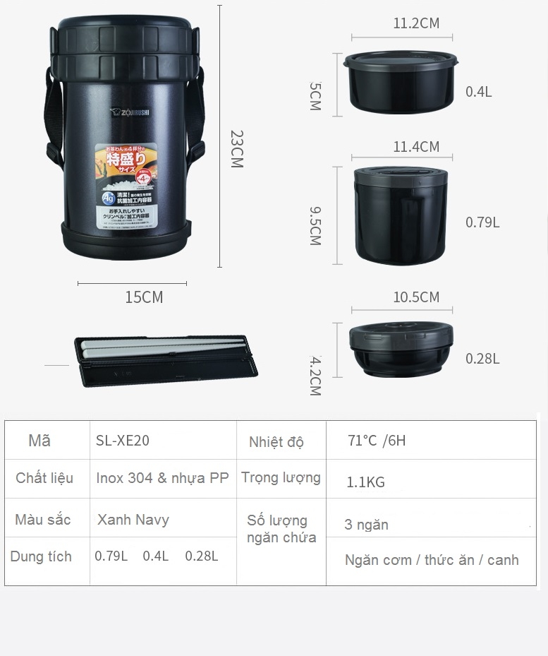Hộp cơm giữ nhiệt 3 ngăn Zojirushi SL-XE20-AD dung tích 1,47L được sản xuất theo tiêu chuẩn khắt khe của Nhật BẢn với bình chứa làm bằng chất liệu thép không gỉ cao cấp bền đẹp, giúp giữ nhiệt cực tốt, và mang lại giá trị sử dụng lâu dài.