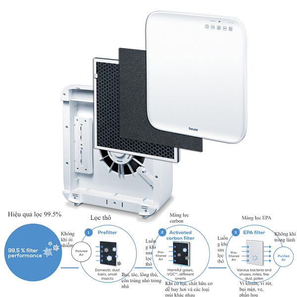 Máy lọc không khí Beurer LR310 sử dụng hệ thống lọc 3 lớp Carbon, Lọc HEPA và than hoạt tính hiệu quả trong việc lọc bụi, làm sạch, làm tươi không khí góp phần chăm sóc sức khỏe cho cả gia đình.