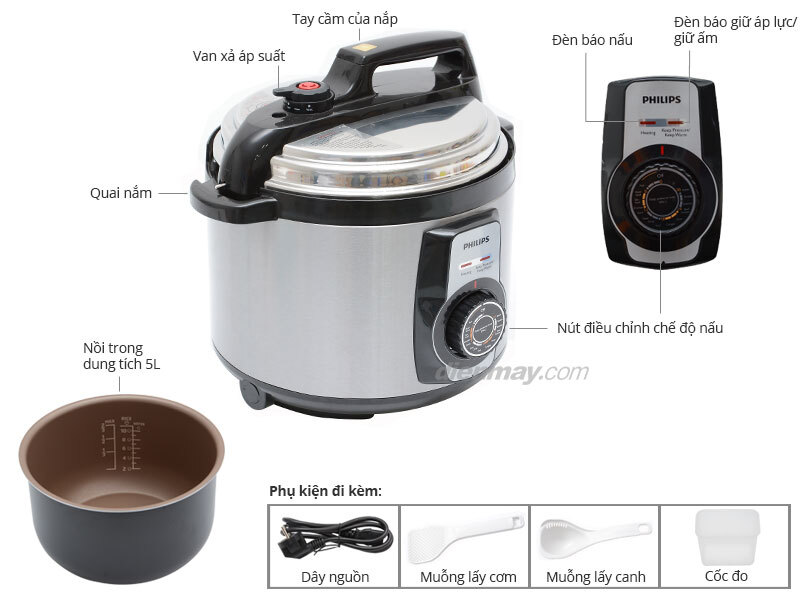 Các chế độ an toàn của nồi áp suất điện Philips HD2103 bao gồm van xả áp thông minh, tự động xả áp suất ra ngoài khi áp suất trong nồi tăng quá cao, đảm bảo an toàn.