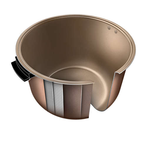 Lớp tráng bên ngoài phủ đồng: giúp giữ nhiệt, giữ cơm ấm và tươi ngon 2. Nhựa bảo vệ: bảo vệ hợp kim, làm cho nồi chắc và bền hơn 3. Hợp kim dày hơn: dẫn nhiệt đều hơn để đảm bảo rằng mỗi hạt gạo được nấu sôi và chín kỹ, đem lại độ tơi mà bạn mong muốn 4. Đáy màu vàng champagne: lan truyền hơi nóng qua khắp nồi trong khi nấu để cơm mịn và ngon hơn 5. Lớp tráng trong suốt siêu cứng: không dính và chống trầy xước, giúp dễ làm sạch và tăng độ bền, hệ thống lòng nồi dày 5 lớp giúp nồi nấu cơm chín đều hơn và giữ nhiệt siêu tốt. Lòng nồi có tay cầm chống chóng và dễ dàng tháo lòng nồi.
